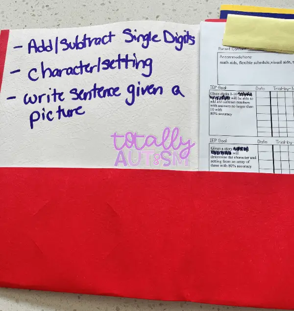 My ESY prep day is almost over! Using the data folders I made in step 2, I highlight the ESY goals that need to be addressed for each student in “quick word” form. See the picture provided below for an example. Do what works for you! I wrote the gist of each ESY goal on the inside of the folder. Then, I grouped students by similar goals. This took me 30 minutes.
